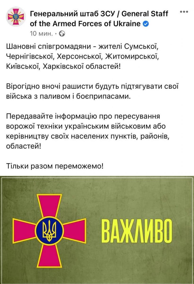 «Шановні співгромадяни — жителі Сумської, Чернігівської, Херсонської, Житомирської, Київської, Харківської областей!