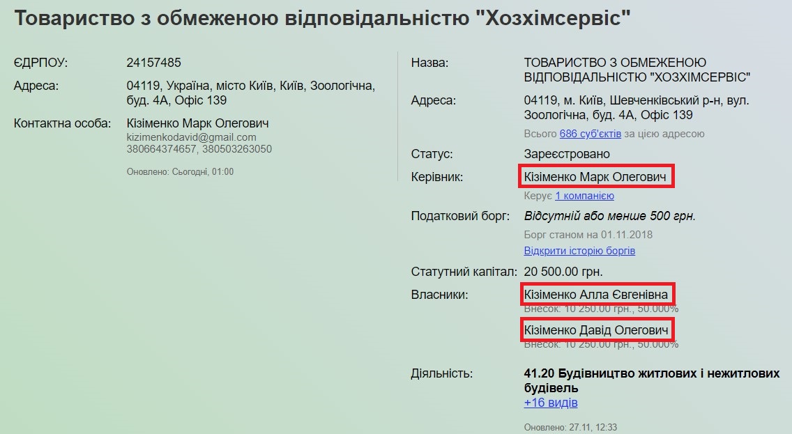Киевским ООО «Хозхимсервис» владеют дончане Алла и Давид Кизименко, руководит ним Марк Кизименко.