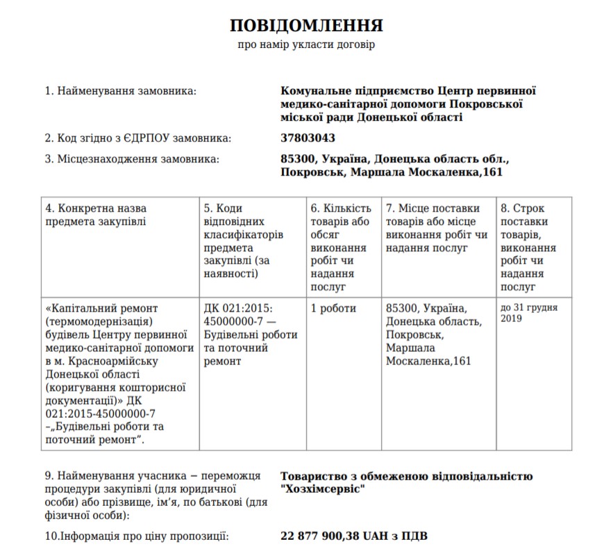 В период с октября по ноябрь 2018 года ООО «Хозхимсервис» получило от местных властей прифронтового Покровска семь заказов на 326 миллионов гривен, сообщает ИА «Вчасно».
